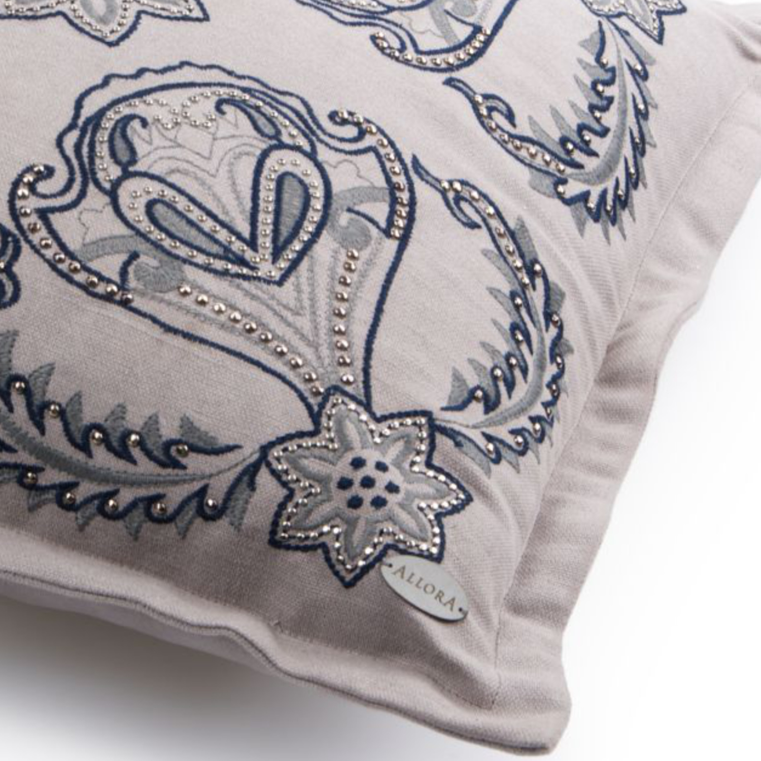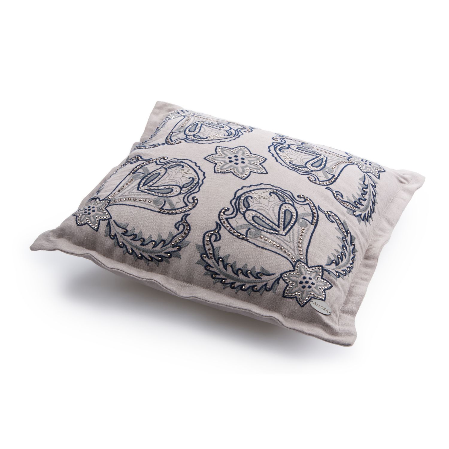 Keten kumaştan şal desen nakışlı metal troklu arkası düz kırlent kılıfı.